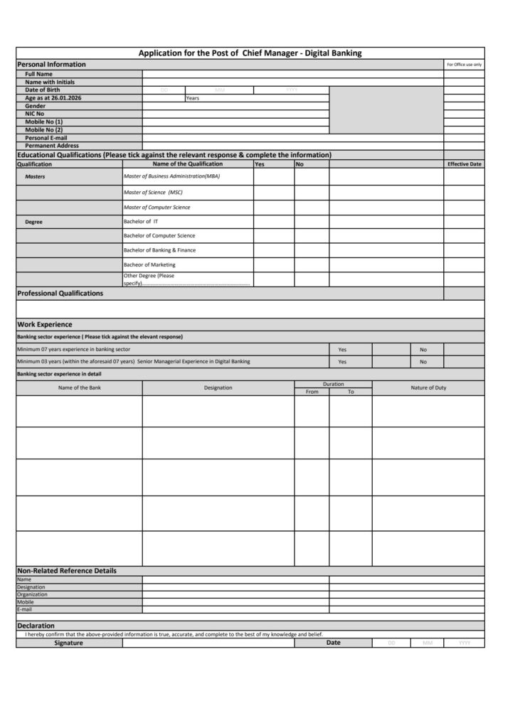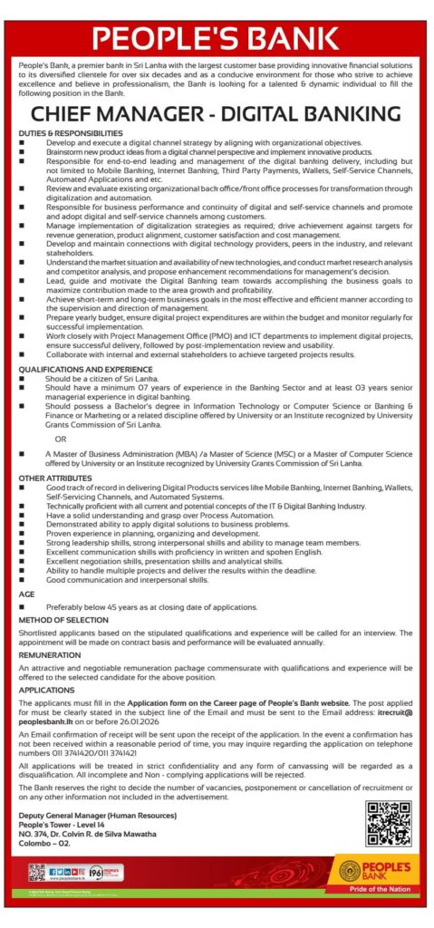 People’s Bank is seeking a dynamic and experienced professional to join our team as Chief Manager Digital Banking.