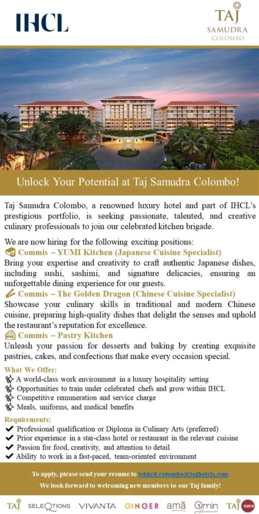 Hotel Commis – Japanese/ Chinese/ Pastry 2 months ago Deadline:- 30th September 2025 Company:- Taj Samudra Colombo Apply now :- tshhrd.colombo@tajhotel.com Post navigation Previous: Internship – TeacherNext: HR Assistant Related Vacancies Driver Finance and Accounts Hotel Receptionist Supervisor Waiter/ Waitress/ Cost Assistant/ Driver/ Housekeeping/ Receptionist 4 days ago Admin Cashier Hotel Human Resources Manager Cashier/ HR/Cook/ Manager/ Crew member 6 days ago Hotel Lecturer Part time Tourism Lecturer – Tourism & Hospitality 7 days ago