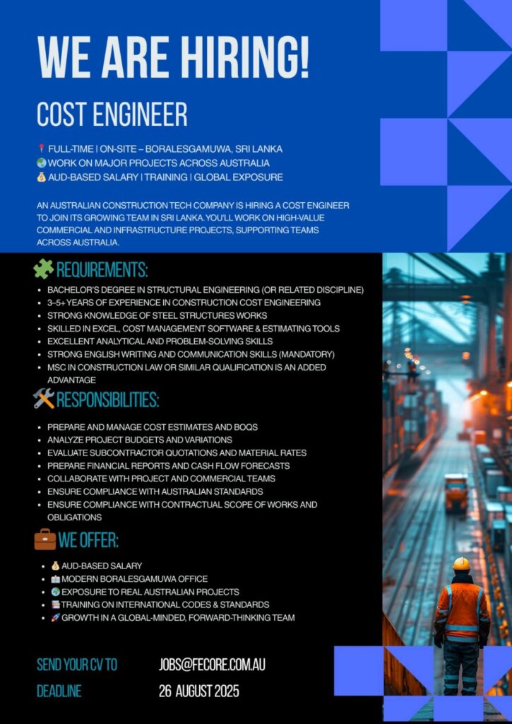 Join our team as a Cost Engineer in Sri Lanka, working on high-value commercial and infrastructure projects across Australia. Gain international exposure, advanced training, and be part of a forward-thinking global team.