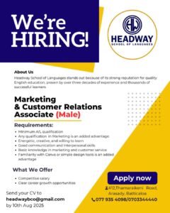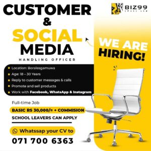 Customer Care Customer Care Representative 2 years ago Source:- Inside Homes Send your CV :- 077 400 7107 Sri Lanka Job vacancy 2024 Post navigation Previous: IT coordinatorNext: Project Manager – IT Related Vacancies Customer Care Digital Marketing Customer Care Agent/ Social Media Executive 3 weeks ago Customer Care Operator Customer Service Assistant/ Digital Project Operator 4 weeks ago Banking Customer Care Finance Manager – Customer Relationship Management 1 month ago