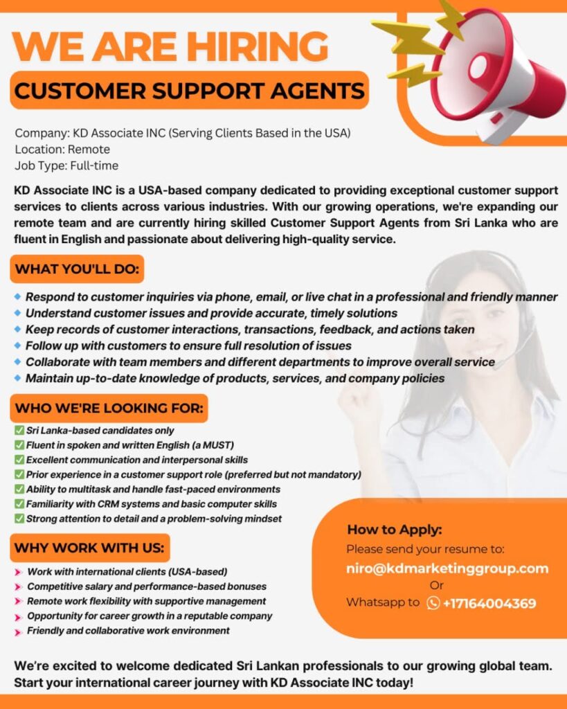 KD Associate INC (USA) is expanding our global remote team and looking for passionate and fluent English-speaking Customer Support Agents based in Sri Lanka.