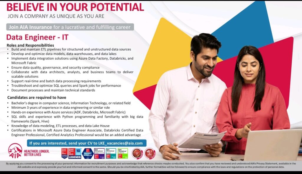 Send your CV to LKE_vacancies@aia.com and unlock your potential with AIA Insurance