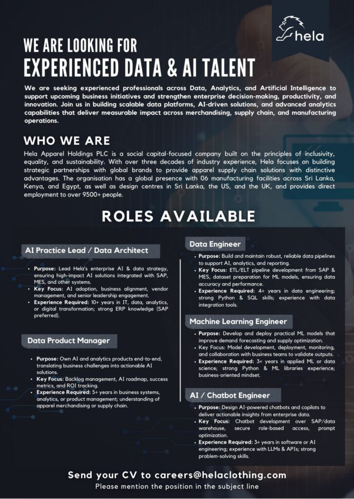 Hela Apparel Holdings PLC is expanding its Data, Analytics, and AI capabilities and is looking for experienced professionals for the following roles: