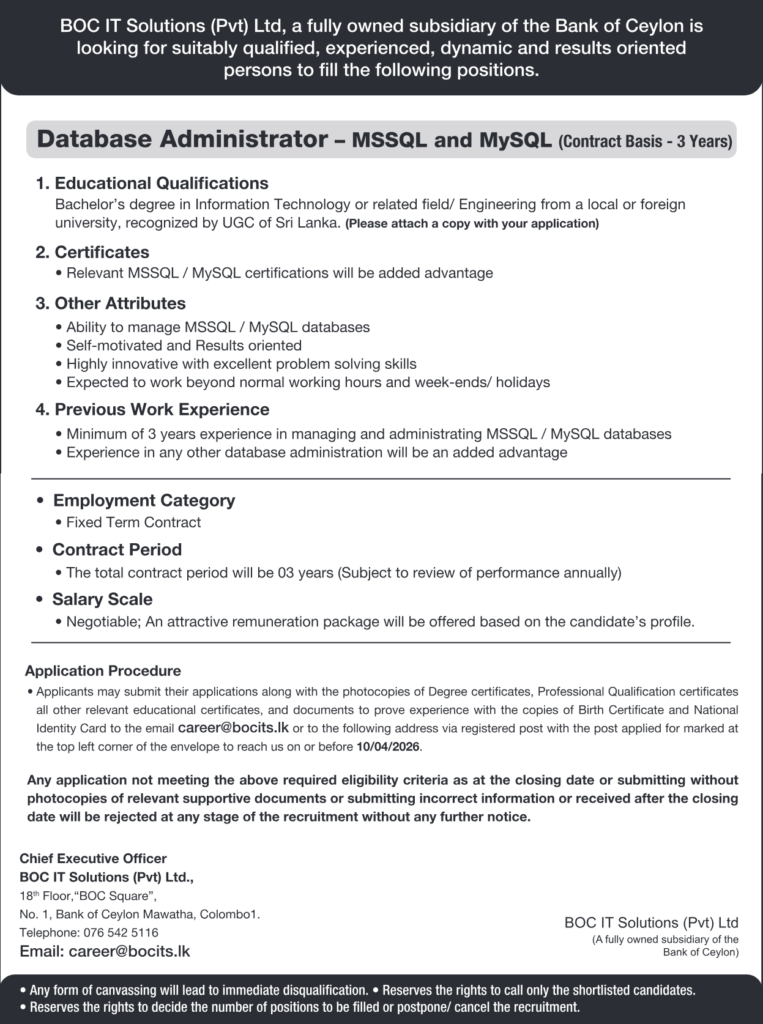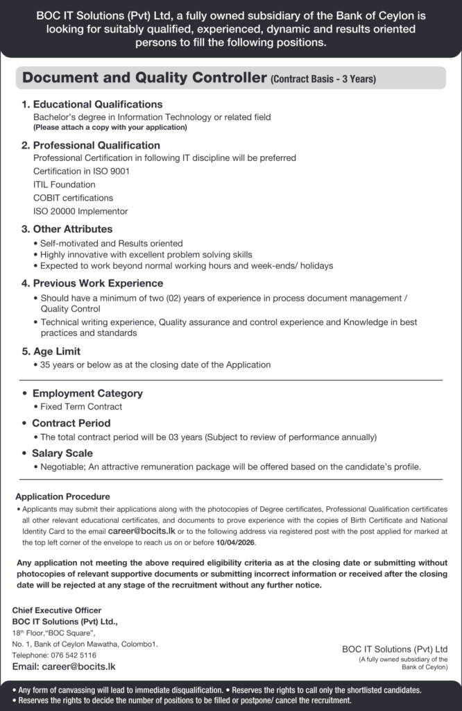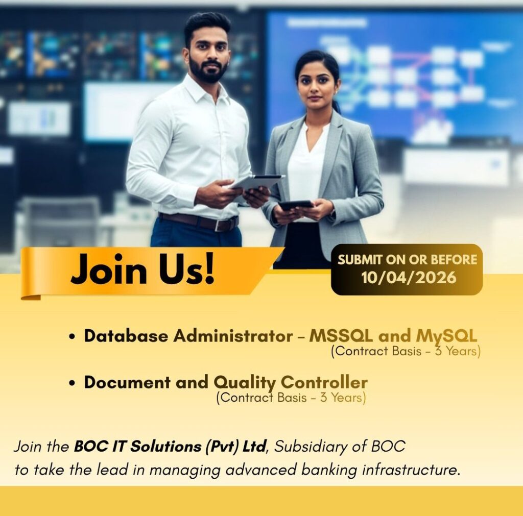 BOC IT Solutions (Pvt) Ltd, a fully owned subsidiary of the Bank of Ceylon, is seeking a suitably qualified, experienced, dynamic, and results-oriented individual to fill the following position: