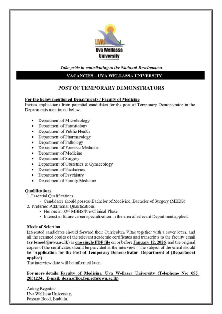 Lecturer Science | Medical Demonstrators – Medicine 1 day ago Deadline:- 12th January 2026 Company:- UVA Wellassa University Apply Now :- ar.fomed@uwa.ac.lk Post navigation Previous: Management TraineeNext: Assistant HR Manager Related Vacancies Internship Sales and Marketing Science | Medical Trainee/ Intern – Product Development & Marketing 23 hours ago Lecturer Science | Medical Temporary Demonstrator – Medicine 4 days ago Internship Science | Medical Medical Pre Internship 4 days ago