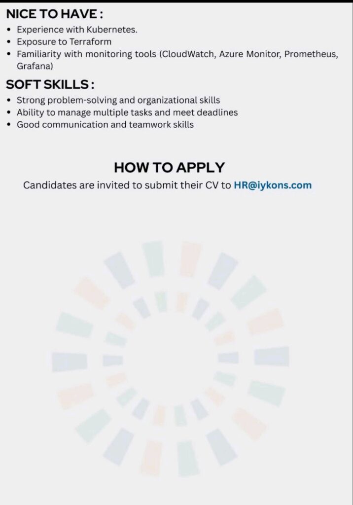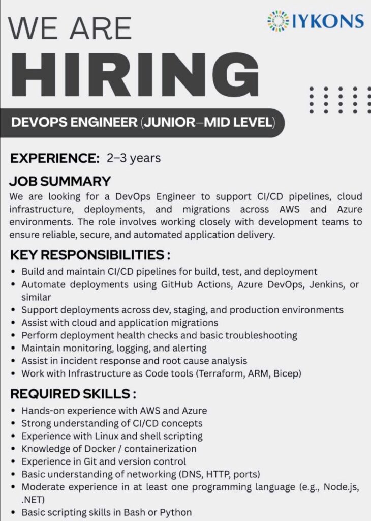 Looking to take the next step in your DevOps career? IYKONS is hiring a DevOps Engineer (Junior-Mid Level) with 2-3 years of experience to work on modern cloud infrastructure and CI/CD pipelines across AWS & Azure.