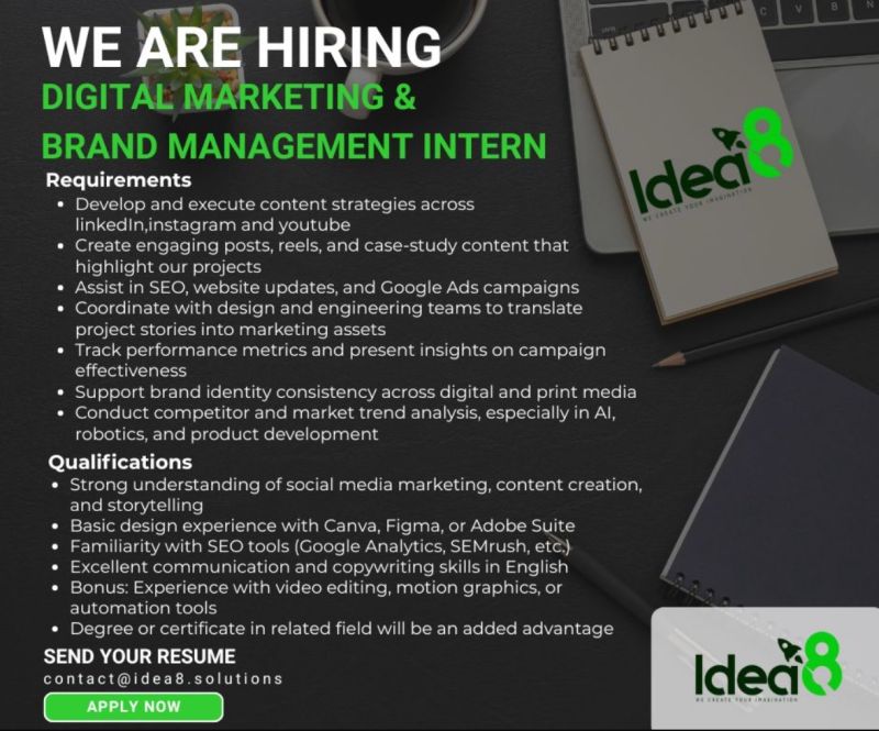 As a Digital Marketing & Brand Management Intern, you’ll work directly with our marketing lead and founders to build and manage our online brand identity. This is not a “sit-and-watch” internship — you’ll create, launch, and analyze real campaigns that influence how the world sees Idea8.