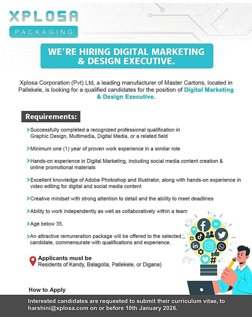 Xplosa Corporation (Pvt) Ltd, a leading manufacturer of Master Cartons located in Pallekele, is looking for a creative, motivated, and skilled Digital Marketing & Design Executive to join our growing team.