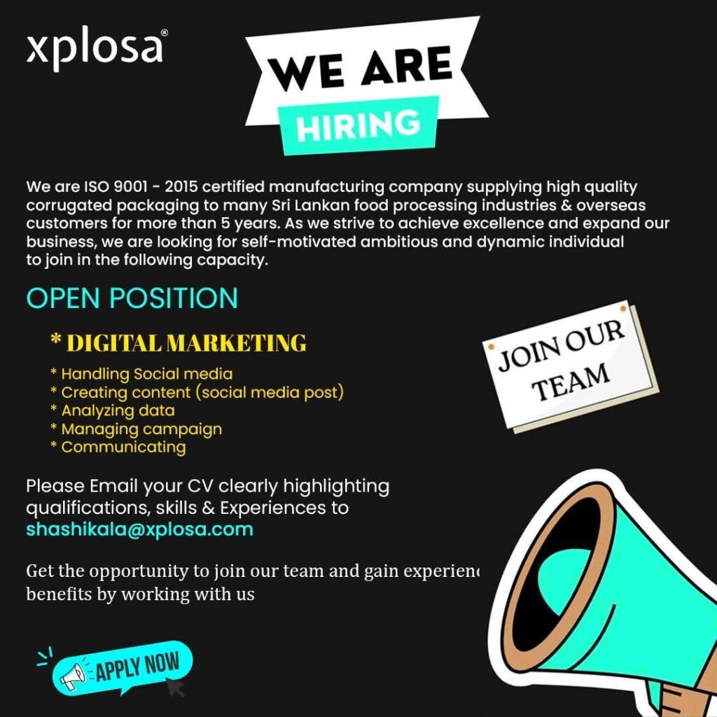 IT Jobs Digital Marketing Executive 9 months ago Company:- xplosa Apply before 25th March 2025 Send your CV :- shashikala@xlposa.com Sri Lanka IT job vacancy Post navigation Previous: Senior Accounts ExecutiveNext: Commis / Chef / Reservation Agent / Supervisor Related Vacancies Internship IT Jobs Remote Work opportunity AI/ML Internship 12 hours ago Art Digital Marketing Graphic Designer Internship IT Jobs Digital Media Executive/ Creative Designer/Accounts Manager/ Internship 20 hours ago IT Jobs UX/ UI Designer 1 day ago
