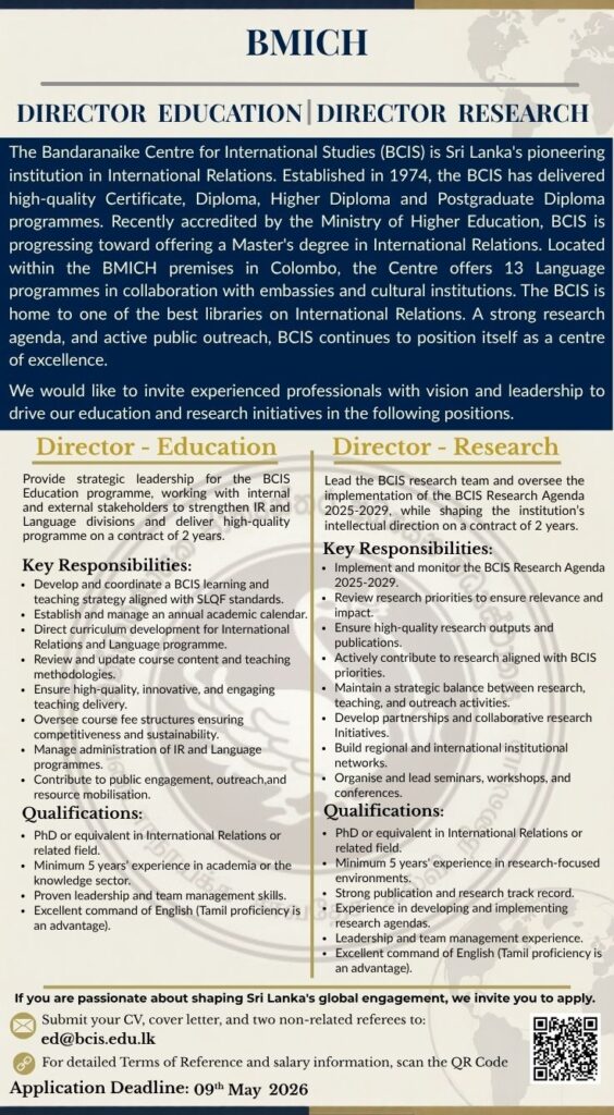 Bandaranaike Centre for International Studies is now hiring for 𝗗𝗶𝗿𝗲𝗰𝘁𝗼𝗿 – 𝗘𝗱𝘂𝗰𝗮𝘁𝗶𝗼𝗻 and 𝗗𝗶𝗿𝗲𝗰𝘁𝗼𝗿 – 𝗥𝗲𝘀𝗲𝗮𝗿𝗰𝗵 positions.