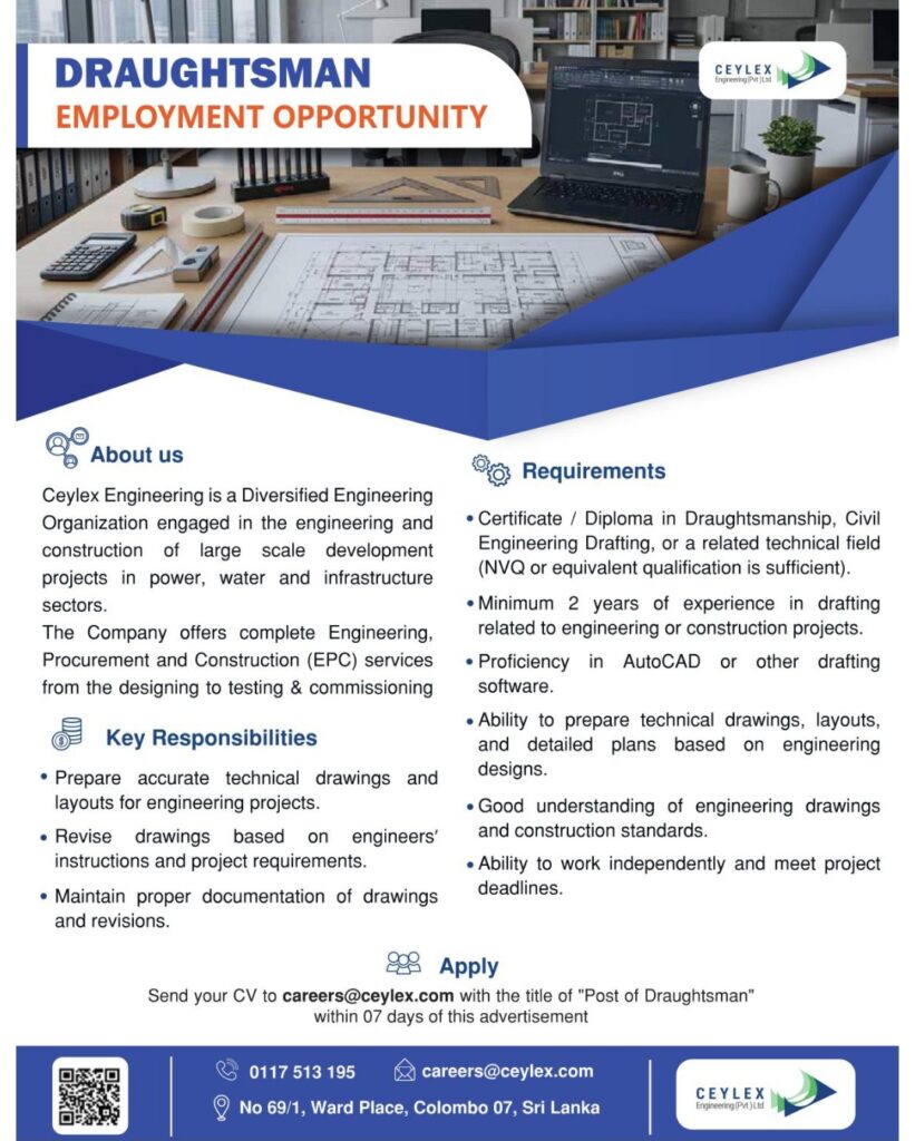 Ceylex Engineering (Pvt) Ltd is looking for a skilled and detail oriented Draughtsman to join our team and support the delivery of high quality engineering and construction projects.