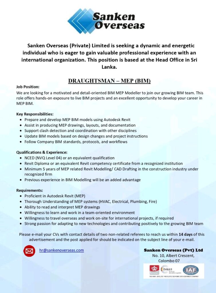 Draughtsman Engineering Draughtsman – MEP( BIM) 2 hours ago Deadline :- 28th January 2026 Company:- Sanken Overseas Apply Now :- hr@sankenoverseas.com Post navigation Previous: Trainee DraftsmanNext: Executive- HR & Administration Related Vacancies Draughtsman Engineering Trainee Draftsman 12 hours ago Engineering Government Job Science | Medical Patent Drafting Professional 12 hours ago Automobile Engineering Automobile Engineer/ Assistant Engineer 12 hours ago