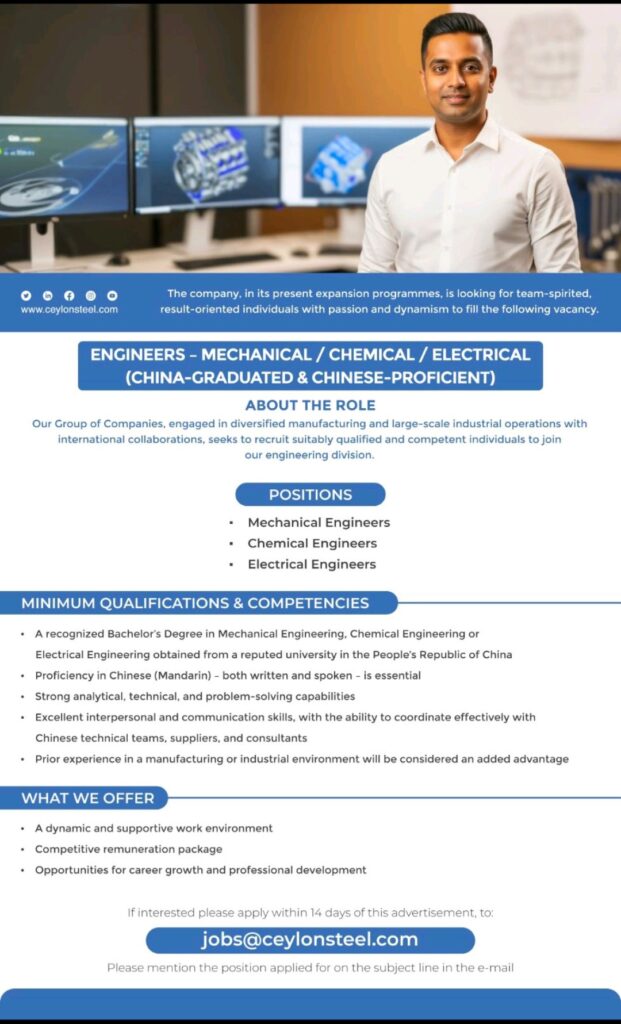 Our Group of Companies, engaged in diversified manufacturing and large-scale industrial operations with international collaborations, seeks to recruit suitably qualified and competent individuals to join our engineering division.