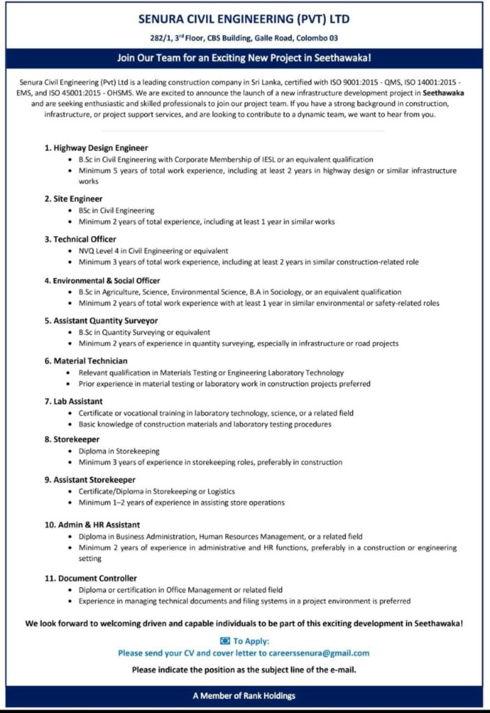 Join Senura Civil Engineering (PVT) LTD as we kick off an exciting new chapter. We’re looking for skilled, motivated professionals across multiple roles in engineering, QS, safety, admin, and more.