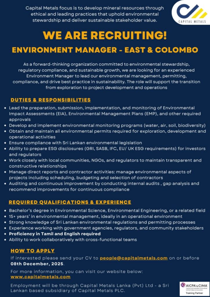 Environment Manager (Flexibility to work from Colombo or Sri Lanka east coast project area)