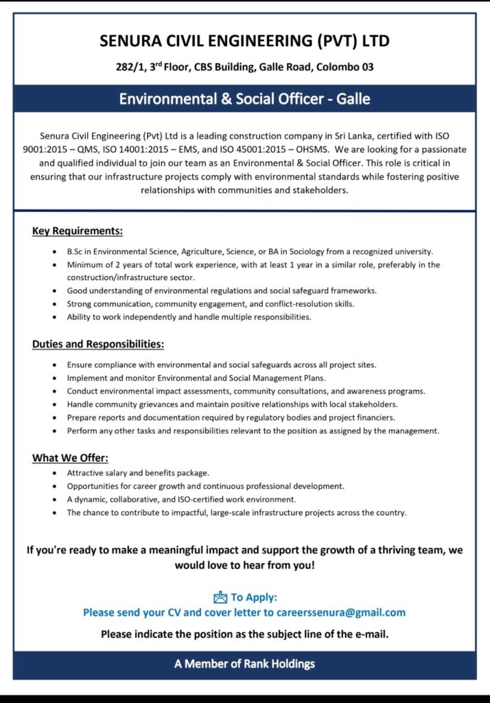 Join our team as an Environmental & Social Officer at Senura Civil Engineering (PVT) LTD – a proudly ISO 9001:2015, ISO 14001:2015, and ISO 45001:2018 certified company.