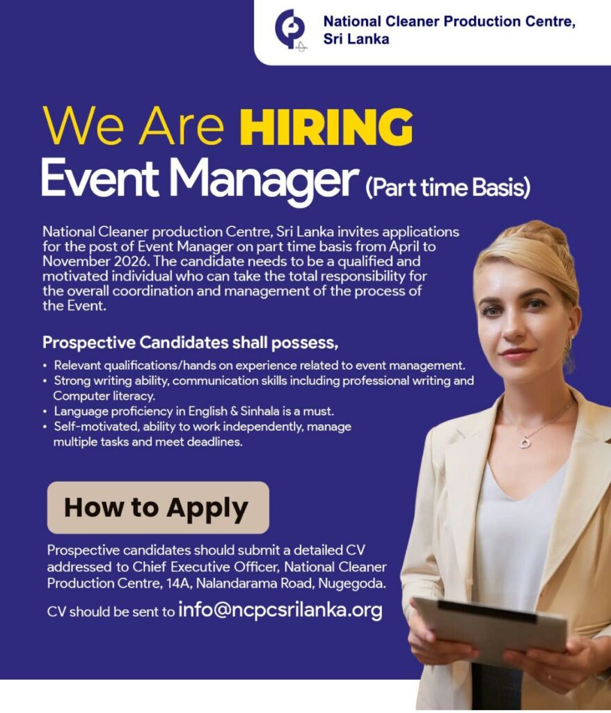 Join the National Cleaner Production Centre, Sri Lanka as an Event Manager (Part-Time) and take the lead in organizing impactful events from April to November 2026.
