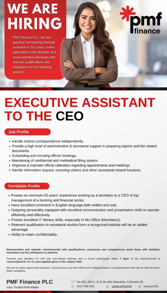 PMF Finance PLC, the fast growing non-banking financial institution in Sri Lanka, invites applications from dynamic and result oriented individuals with relevant qualifications and experience for the