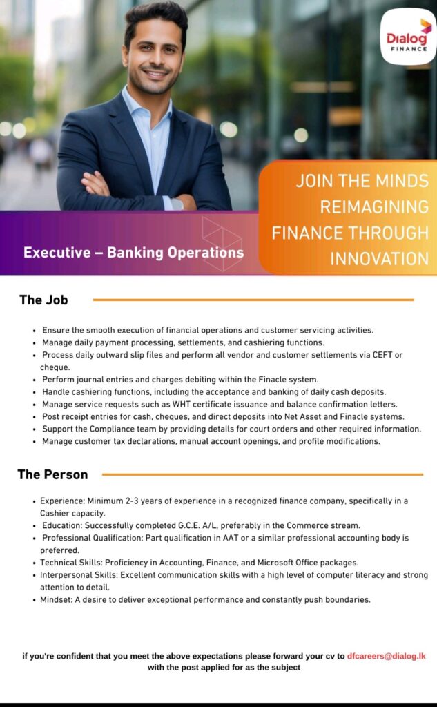 Dialog Finance PLC is looking for a dynamic and detail-oriented Executive – Banking Operations to join our team. If you have experience in cashiering, a knack for financial systems like Finacle, and a drive for excellence, this is your opportunity to grow with an innovation-driven leader in the finance industry.