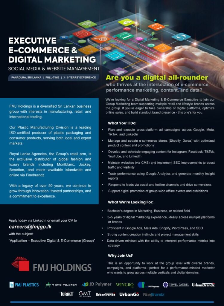 careers@fmjgp.lk with the subject: โApplication โ Executive Digital & E-Commerce (Group)โ