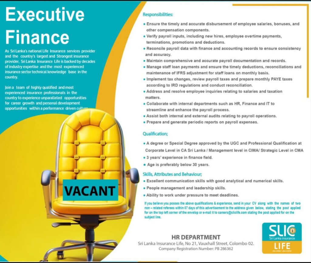 Sri Lanka Insurance Life is seeking a skilled finance professional with expertise in payroll to join us as Executive – Finance (Payroll).