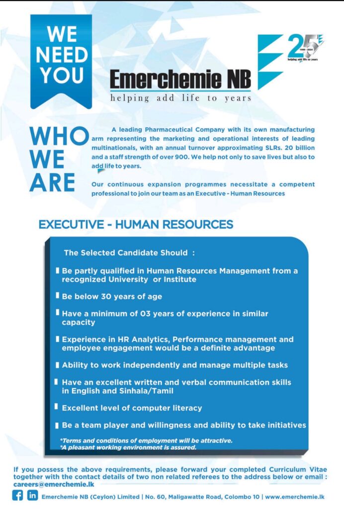 Human Resources Executive – Human Resources 6 days ago Deadline :- 16th December 2025 Company:- Emerchemie Nb Apply Now :- careers@emerchemie.lk Colombo Job Vacancy Post navigation Previous: Production ManagerNext: Deputy Director General Related Vacancies Human Resources Assistant General Manager – HR & Administration 17 hours ago Engineering Human Resources Internship Production Executive Quality Assurance Internship – HR/ Engineering/ QA/ Production 1 day ago Human Resources Manager HR Manager 1 day ago