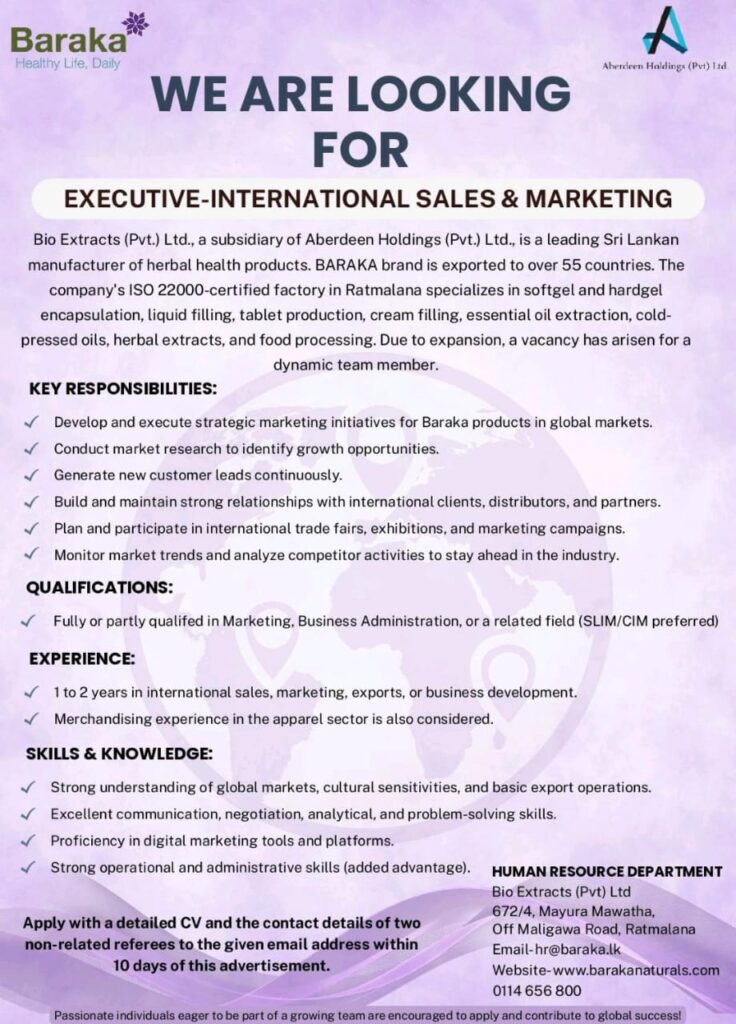 Send your CV :- hr@baraka.lk