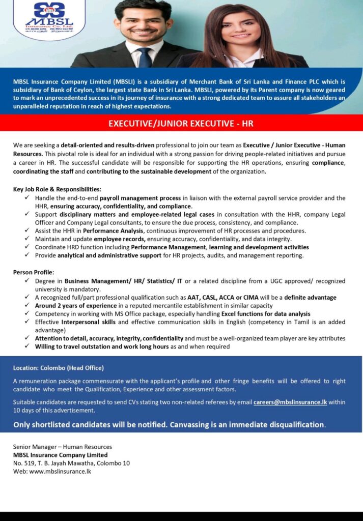 MBSL Insurance Company Limited is seeking a passionate and detail-oriented professional to join our HR team as an Executive / Junior Executive Human Resources. If you’re driven by people, processes, and performance – this is your chance to be part of a dynamic organization.
