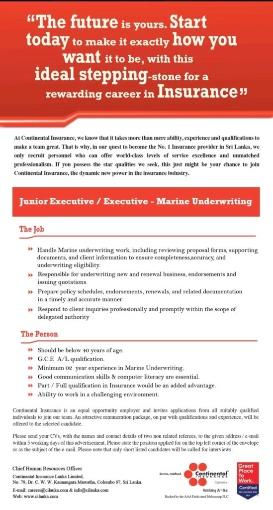 Take your career to the next level with the No. 1 ranked general insurer in Sri Lanka.