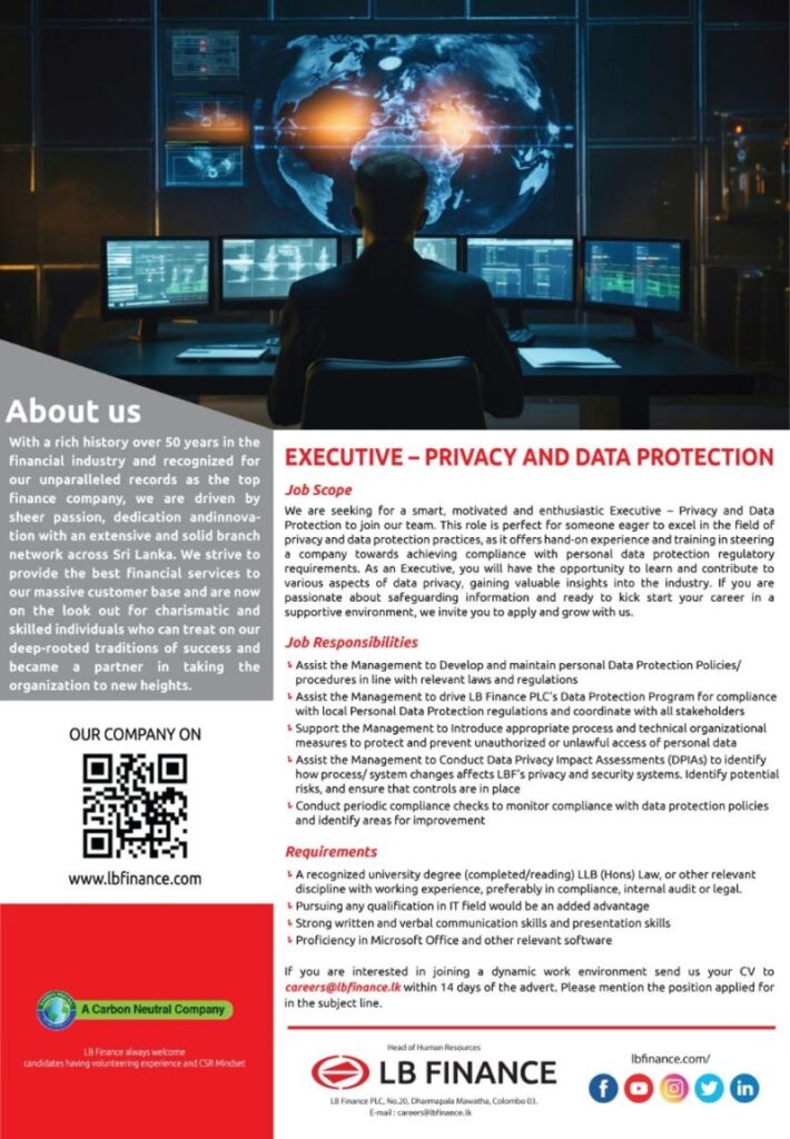 Are you passionate about safeguarding data and driving compliance with privacy regulations? Join LB Finance PLC as an Executive β Privacy and Data Protection and play a key role in developing policies, conducting risk assessments, and supporting our Data Protection Program.