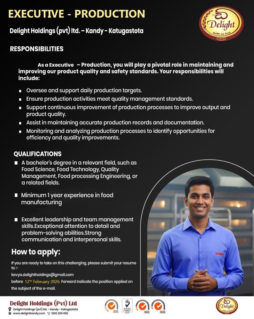 Delight Holdings (Pvt) Ltd is looking for a dynamic Executive – Production to join our team in Kandy -Katugastota. If you are passionate about quality standards, process efficiency, and leadership, this is the perfect opportunity for you!