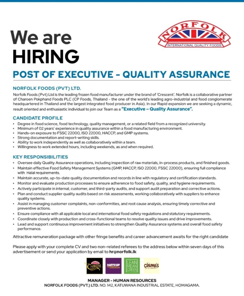 Norfolk Foods (Pvt) Ltd is looking for a dedicated Quality Assurance Executive to ensure our products meet the highest standards of quality and food safety.
