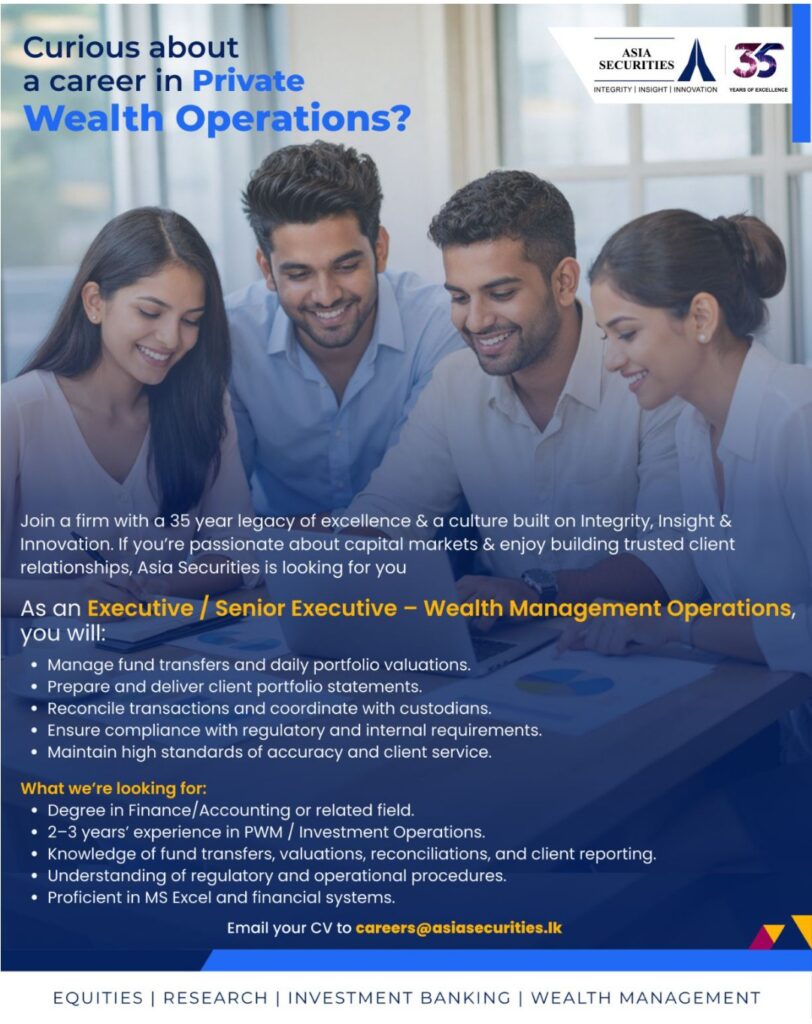 Begin the next chapter of your career with a leader in Sri Lanka’s capital markets. Asia Securities is seeking an Executive / Senior Executive to join our Wealth Management operations team.