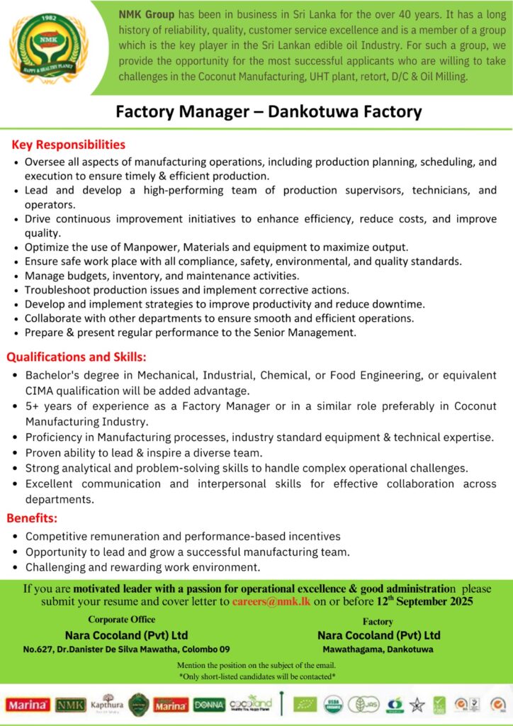 Apply Now :- careers@nmk.lk