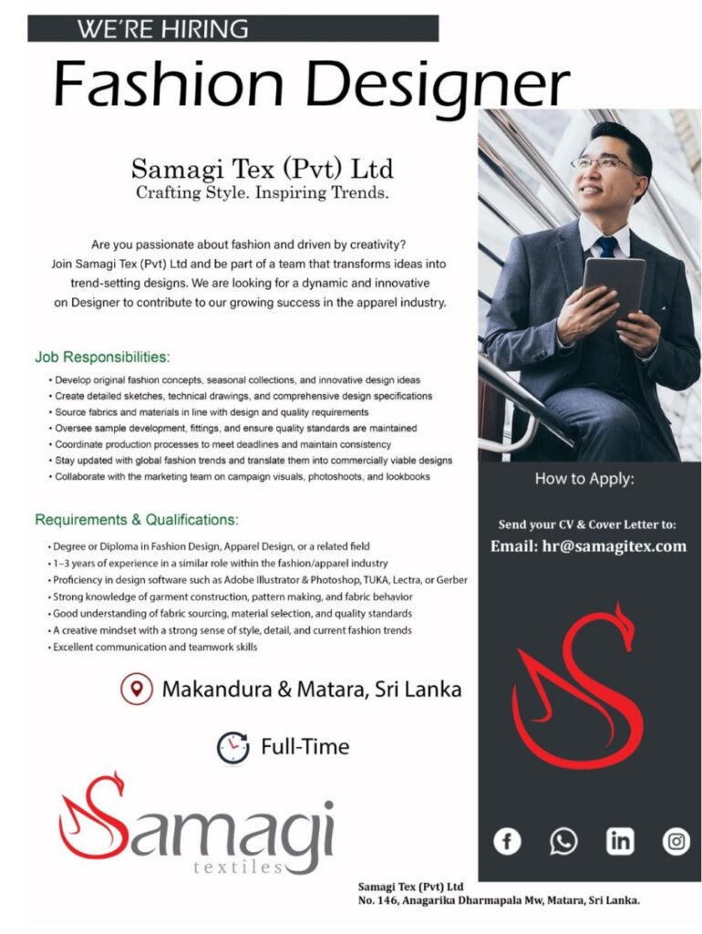 Samagi Tex (Pvt) Ltd is looking for a creative and passionate Fashion Designer to join our team and contribute to innovative apparel designs.