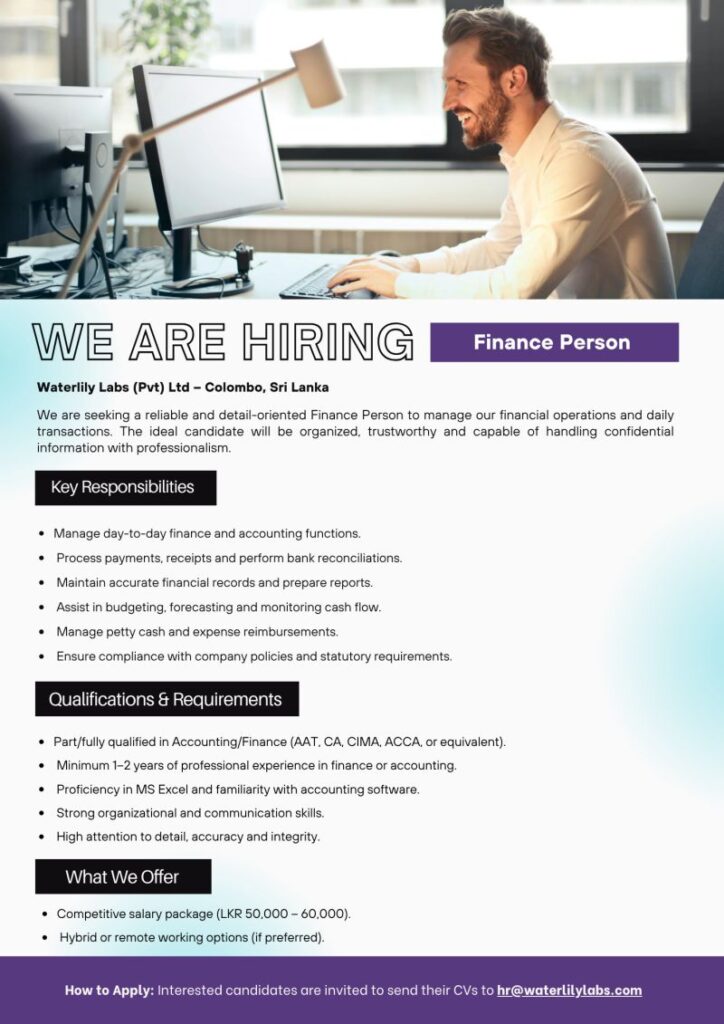 We’re Hiring – Finance Officer Location: Colombo, Sri Lanka Waterlily Labs is looking for a reliable and detail-oriented Finance Person to manage our daily financial operations.