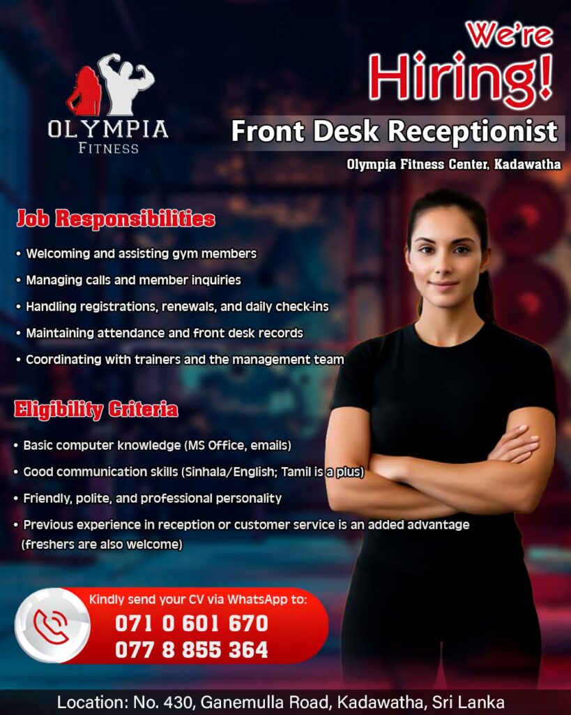 Olympia Fitness Kadawatha is looking for a Front Desk Receptionist to support our growing member community.