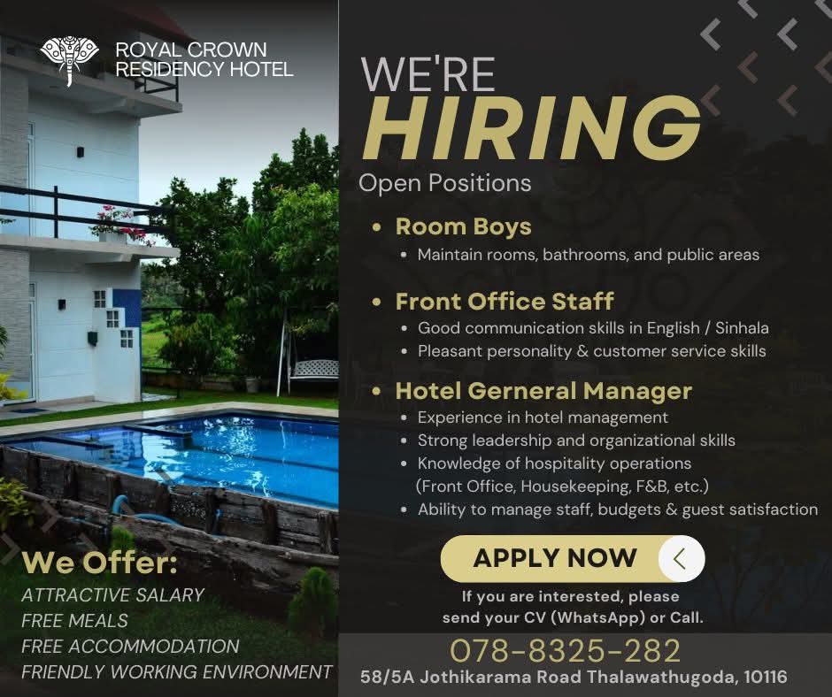 Royal Crown Hotel is expanding our team! We are looking for motivated and reliable staff to join us.