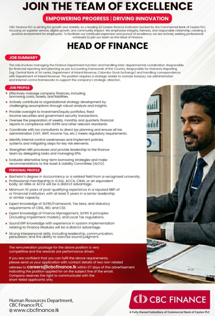 Are you a strategic financial leader ready to drive innovation in the banking and finance sector? CBC Finance PLC, a subsidiary of Commercial Bank of Ceylon PLC, is looking for a visionary Head of Finance to join our leadership team.