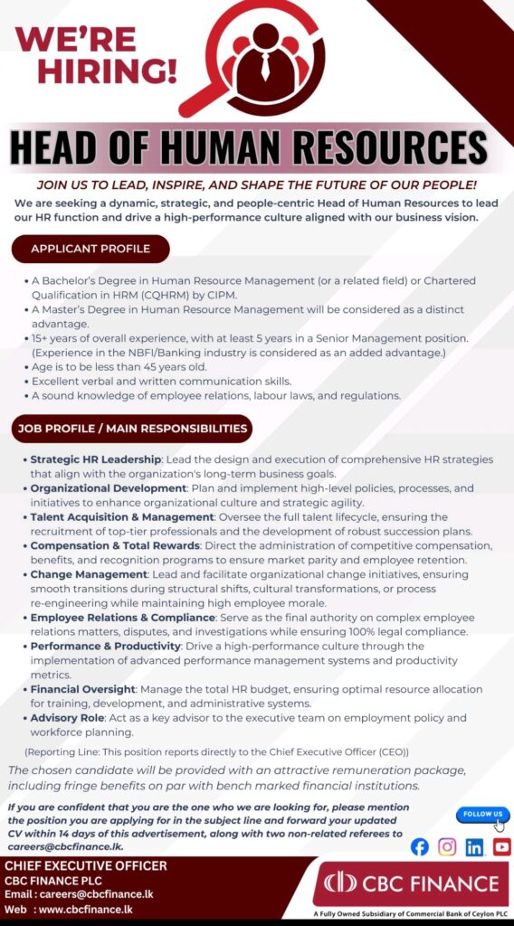 Are you a people-centric leader with a strategic mindset? Join CBC Finance PLC and take the lead in inspiring, developing, and shaping our workforce.