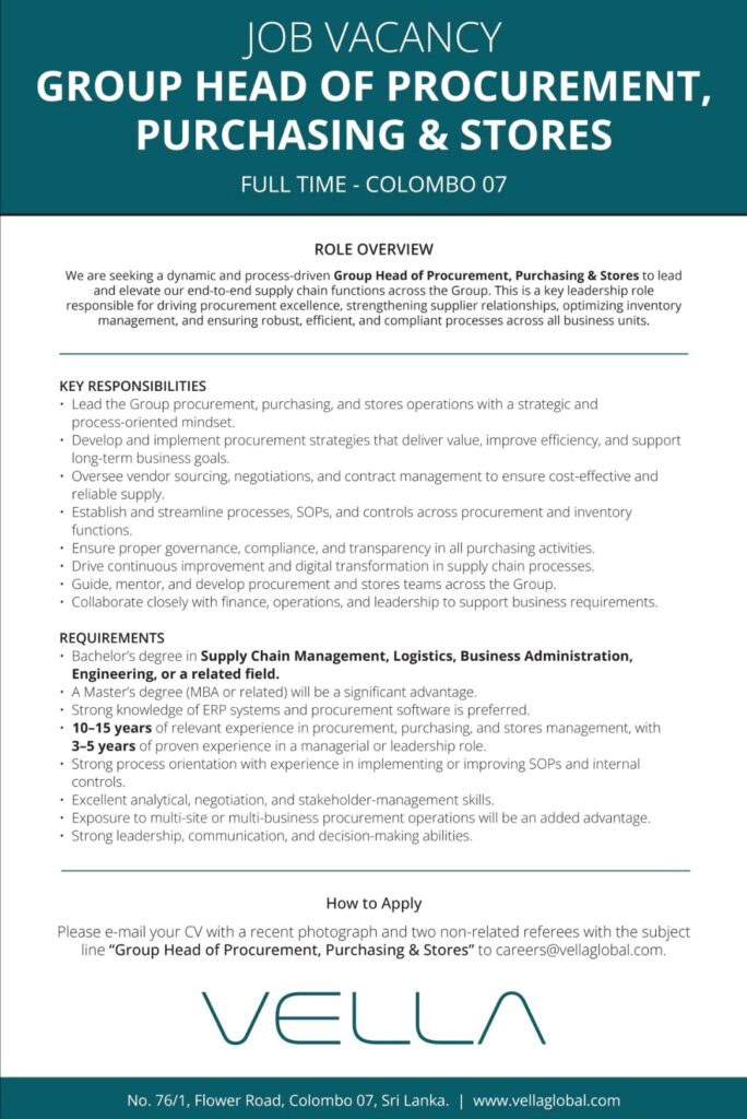 Vella Group is looking for a dynamic and strategically minded Group Head of Procurement, Purchasing & Stores to lead our end-to-end sourcing, purchasing, and inventory management functions across the Group.