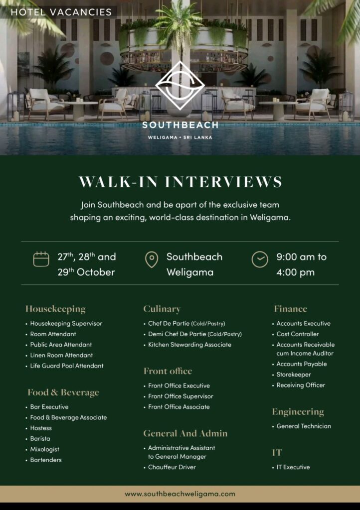 Be part of something extraordinary. Southbeach Weligama, a pre-opening property, is hosting walk-in interviews for passionate, dedicated professionals looking to build a career in a world-class hospitality destination.
