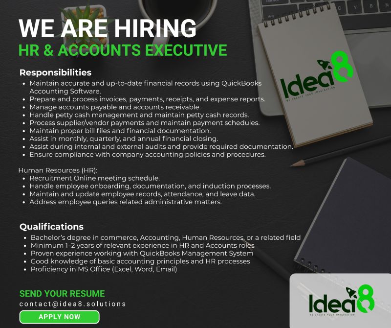 We are looking for a responsible and detail-oriented HR & Accounts Executive to handle day-to-day accounting operations along with core HR functions.