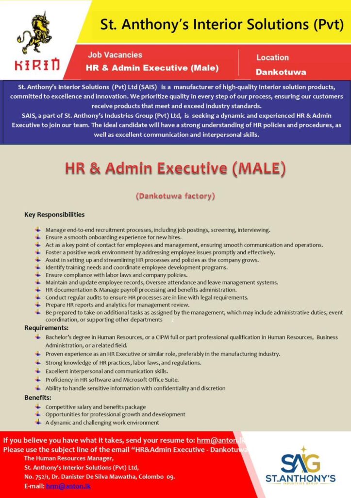 Vacancy @ St. Anthony’s Interior Solutions – Dankotuwa – HR Executive – male