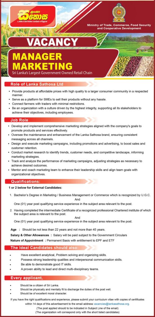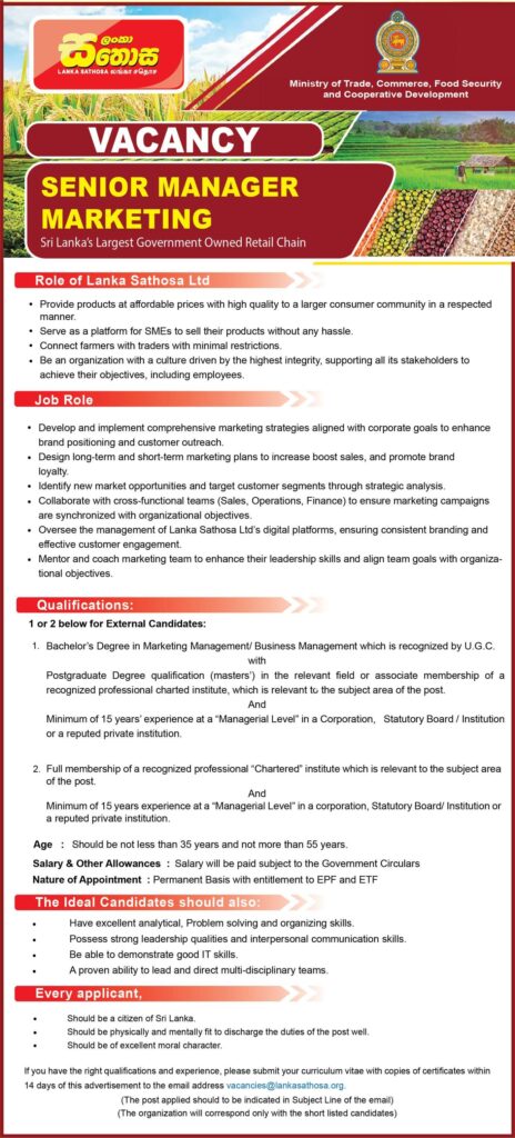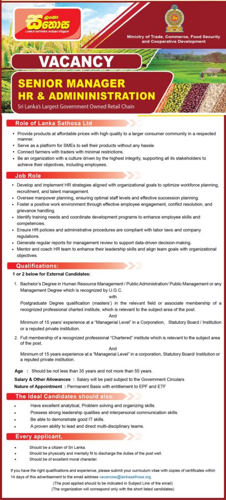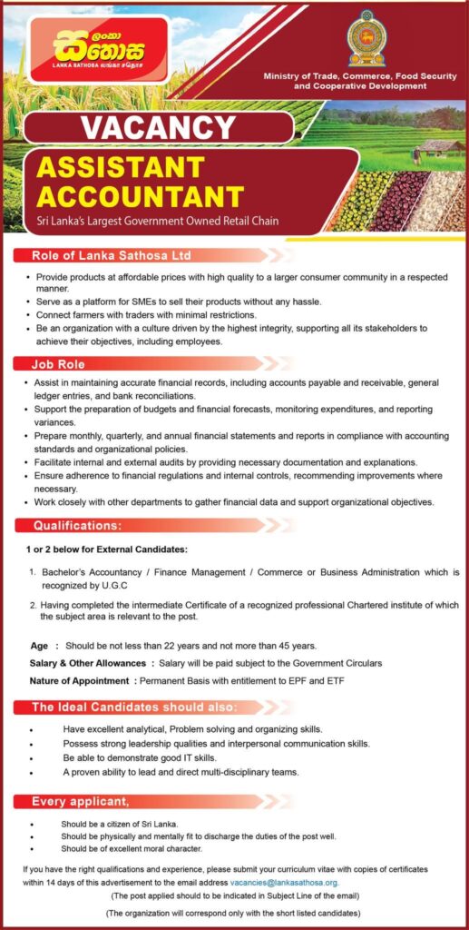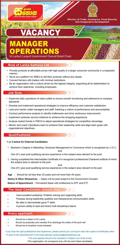 💼 Lanka Sathosa is now accepting applications for the following positions:
