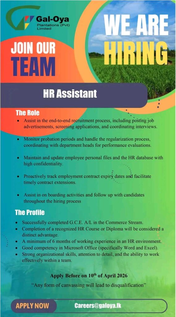 Gal-Oya Plantations (Pvt) Limited is looking for a motivated and detail-oriented HR Assistant to join our team!