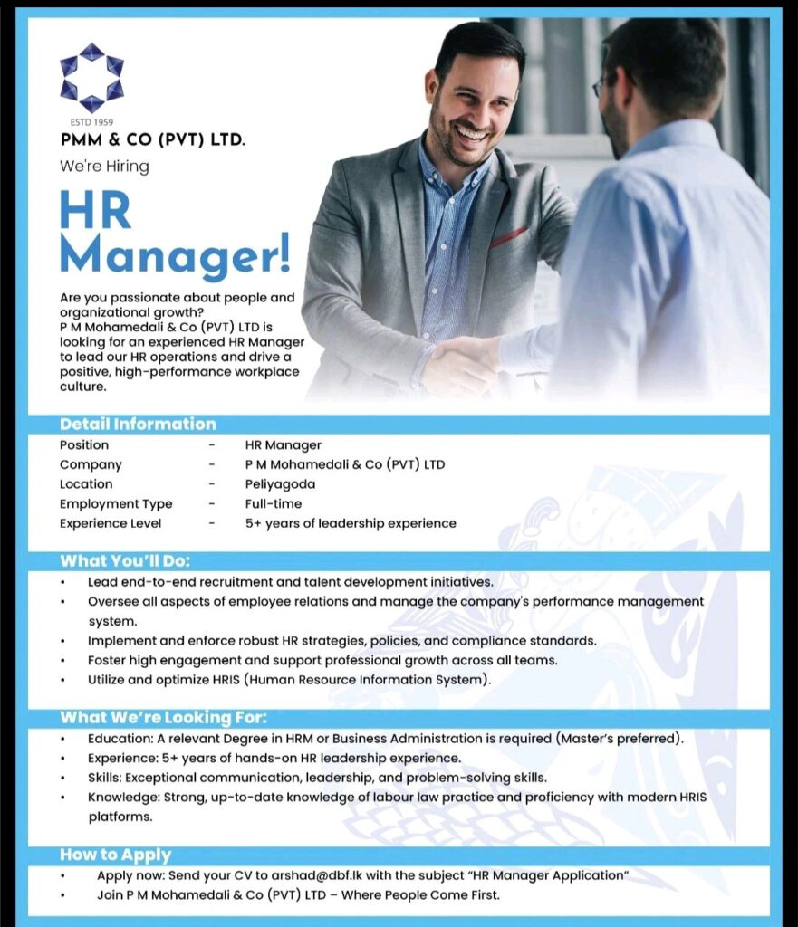 Human Resources Manager HR Manager 11 hours ago Deadline :- 17th January 2026 Company:- PMM & Co Pvt ltd Location:- Peliyagoda Apply Now:- arshad@dbf.lk Post navigation Previous: Assistant Manager – HRNext: Maintenance Management Internship Related Vacancies Human Resources Human Resources Supervisor 59 minutes ago Human Resources Internship Junior Executive – HR & HR Internship 7 hours ago Finance and Accounts Human Resources IT Jobs Sales and Marketing Supply chain Tourism Travel Supply Chain/ IT/ HR/ Accounts/ Sales & Marketing 10 hours ago