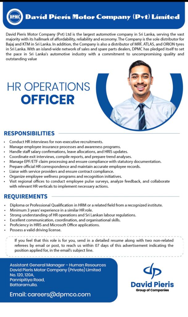 Join Sri Lanka’s largest automotive company! David Pieris Motor Company is looking for a dedicated HR Operations Officer to strengthen our HR team.