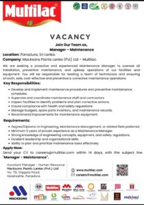 Minimum 4 – 5 years factory experience is required, pls forward your updated resumes or refer someone who you believe would excel in this role to:trisettef@lolc.com