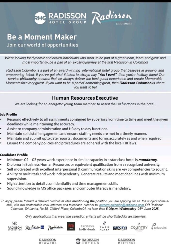 If anyone interested, send your CV’s to careers.colombo@radisson.com mentioning the position applied for, as the subject of the email..